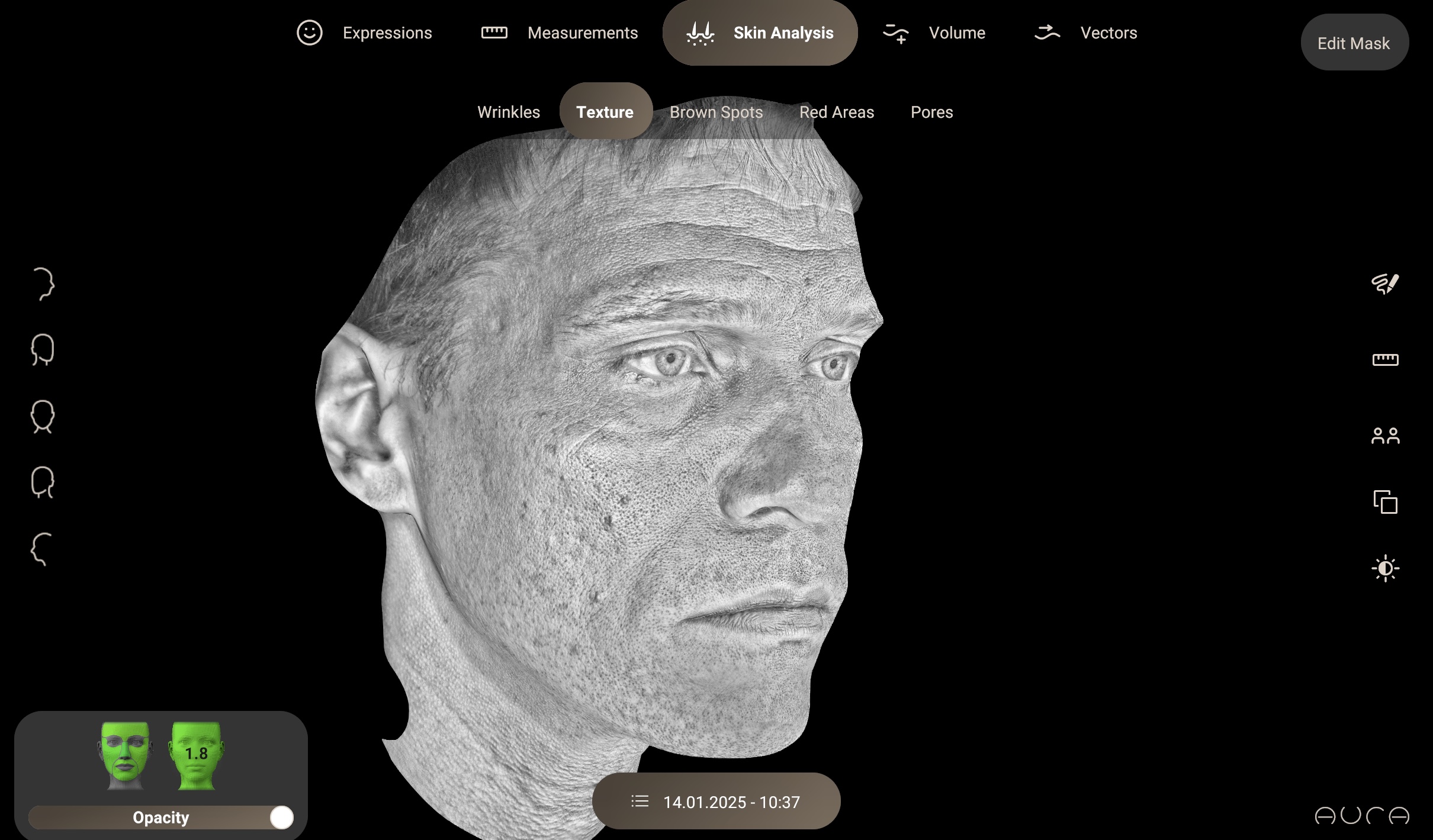 - Captura instantánea y detallada: Con una sola toma, el sistema genera un gemelo digital fotorrealista del rostro y cuello, proporcionando un análisis profundo y preciso.